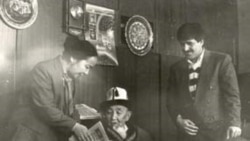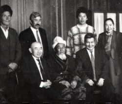 Сүрөттө: Жаныбек казынын уулу Маматураим белгилүү коомдук ишмер С. Жигитов, «Азаттыктын» кабарчылары Жаркын Темирбаева, тарыхчы Кыяз Молдокасымов жана башка адамдар менен вице-президент Ф. Куловдун кабыл алуусунда. 1993-жыл.