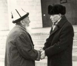 Сүрөттө: Жаныбек казынын уулу Маматураим жазуучу Төлөгөн Касымбеков менен. 1993-жыл.