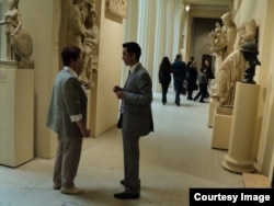 Музейден окуучуларын жетелеген класс жетекчини кездештирдик. Балдар менен кошо басып, илинип турган сүрөттөр тууралуу кыскача баяндап, тарых, көркөм өнөр жөнүндө айтып берип, баалуулуктарды билүү керектигин түшүндүрүп жатты.